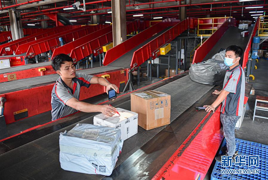 11月8日,工作人员在顺丰速运海口美兰中转场进行快递分拣作业。 临近“双十一”,位于海口的顺丰速运海口美兰中转场一片繁忙景象。工作人员借助分拣设备,抓紧时间分拣、打包快递,保障快递在“双十一”物流高峰期间正常流转。 新华社记者 蒲晓旭 摄