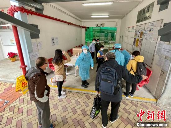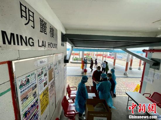 12月14日,香港卫生署卫生防护中心在黄大仙彩云(二)邨明丽楼设立领取样本瓶登记处,职员穿防护衣物向居民派发深喉唾液样本瓶。卫生防护中心13日指香港黄大仙彩云(二)邨明丽楼录得有三个单位、共四人确诊新冠肺炎。图为香港黄大仙彩云(二)邨明丽楼。