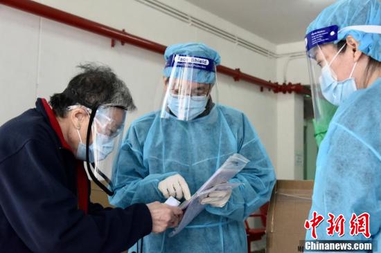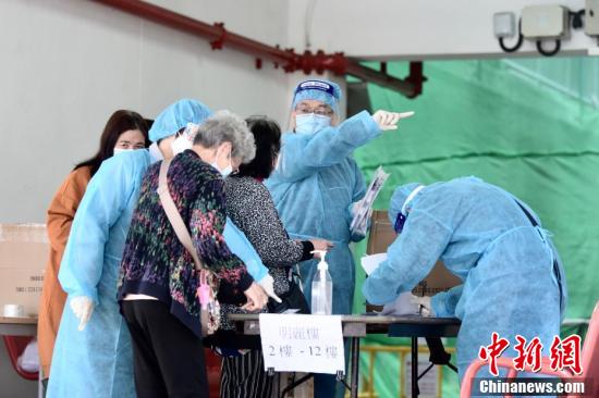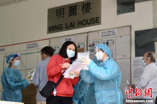 图为身穿防护衣物职员为明丽楼居民登记及派发检测样本瓶。