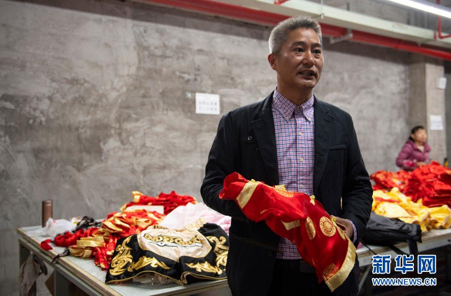 苏礼宏在云南省镇雄县鲁家院子易地扶贫搬迁安置点“宝涛服装”扶贫车间内展示样品(11月13日摄)。