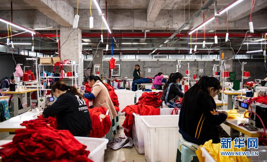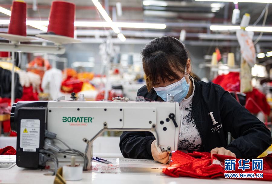 搬迁群众在云南省镇雄县鲁家院子易地扶贫搬迁安置点“宝涛服装”扶贫车间内缝制衣物(11月13日摄)。