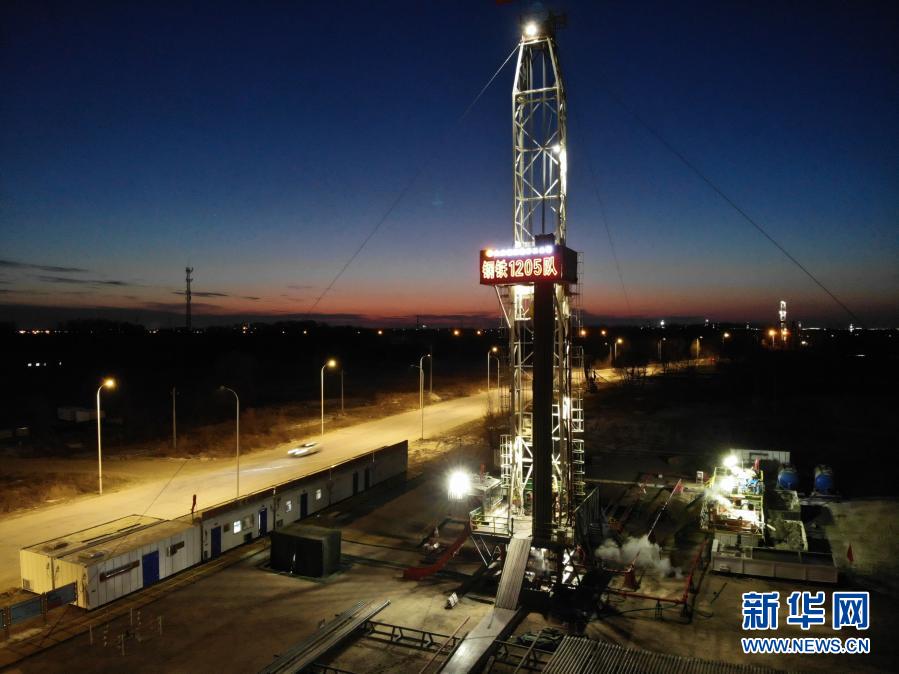大庆油田1205钻井队钻井工人在野外钻井平台作业(无人机照片,2020年12月28日摄)。新华社记者 王松 摄