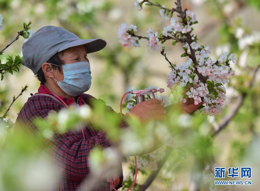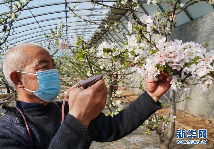 1月28日,赞皇县土门乡龙堂院村的果农在花果山生态农业园区大棚内给樱桃花授粉。