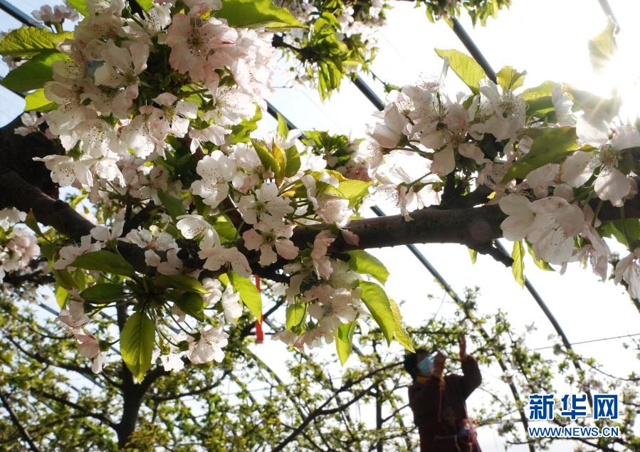 1月28日,赞皇县土门乡龙堂院村的一名果农在花果山生态农业园区大棚内给樱桃花授粉。