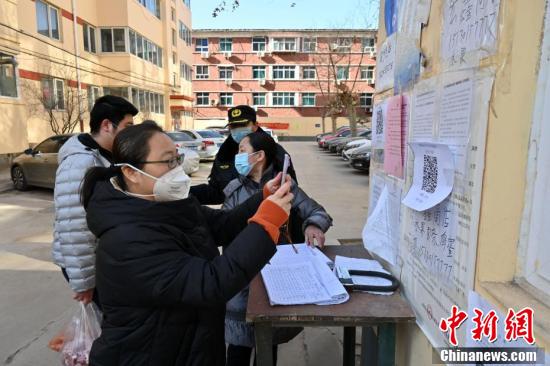图为石家庄部分区域市民扫码、登记测温后,可以进出小区。 中新社记者 翟羽佳 摄