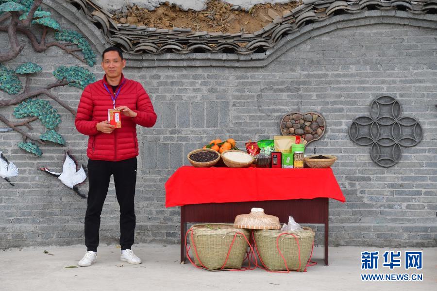 1月28日,在钦州市浦北县乐民镇金康村,驻村工作队队员在展示农特产品。新华社记者 黄孝邦 摄