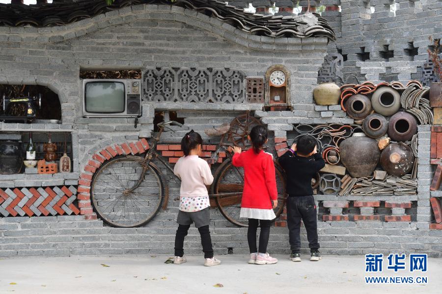 1月28日,在钦州市浦北县乐民镇金康村,小朋友在镶嵌着老物件的墙前玩耍。新华社记者 黄孝邦 摄