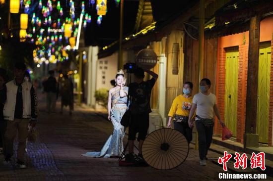 2月25日,云南西双版纳,一名游客正在拍摄写真。景洪市告庄夜市是当地较为热闹的夜市,吸引不少游客前往,富有民族元素的“旅拍”成为夜市的热门项目。