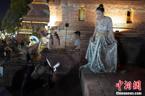 2月25日,云南西双版纳,一名游客正在拍摄民族风情的照片。景洪市告庄夜市是当地较为热闹的夜市,吸引不少游客前往,富有民族元素的“旅拍”成为夜市的热门项目。