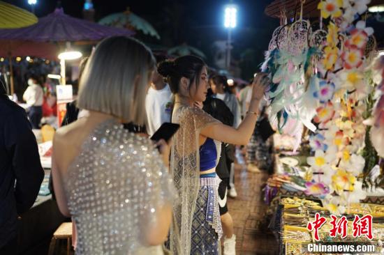 2月25日,云南西双版纳,游客在夜市挑选供拍摄使用的饰品。景洪市告庄夜市是当地较为热闹的夜市,吸引不少游客前往,富有民族元素的“旅拍”成为夜市的热门项目。