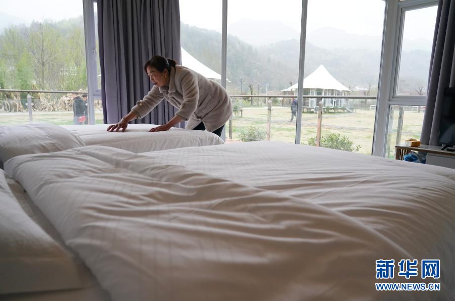 3月17日,石泉县饶峰镇胜利村村民吴秀梅在整理民宿房间。新华社记者 邵瑞 摄