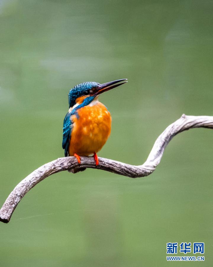 3月22日,在福州西湖公园的荷塘一角,一只翠鸟在水边的树枝上停歇。