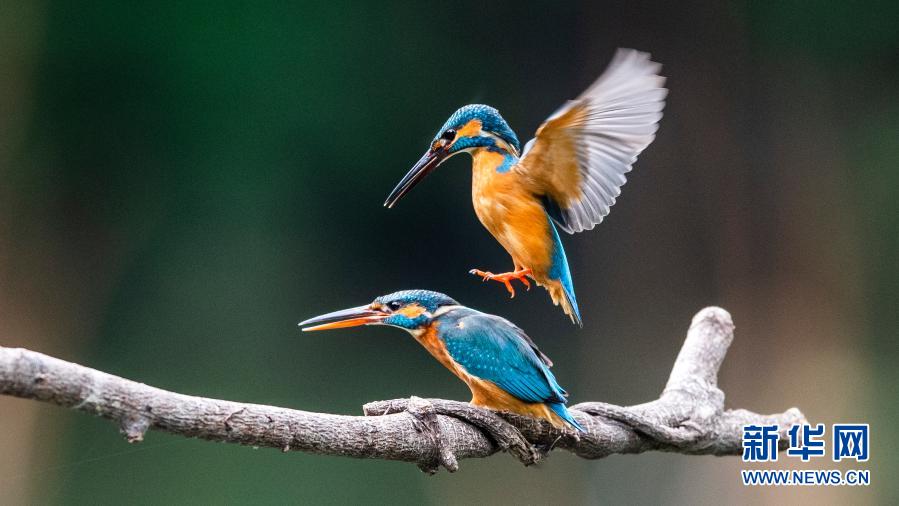 3月22日,在福州西湖公园的荷塘一角,两只翠鸟在水边的树枝上嬉戏。
