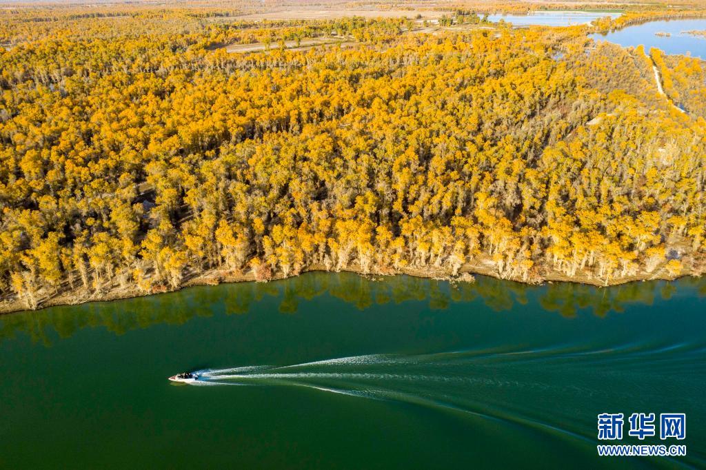 在新疆塔里木河畔的阿克苏地区沙雅县月亮湾景区,游客乘坐快艇欣赏胡杨美景(2020年10月22日摄,无人机照片)。新华社记者 胡虎虎 摄