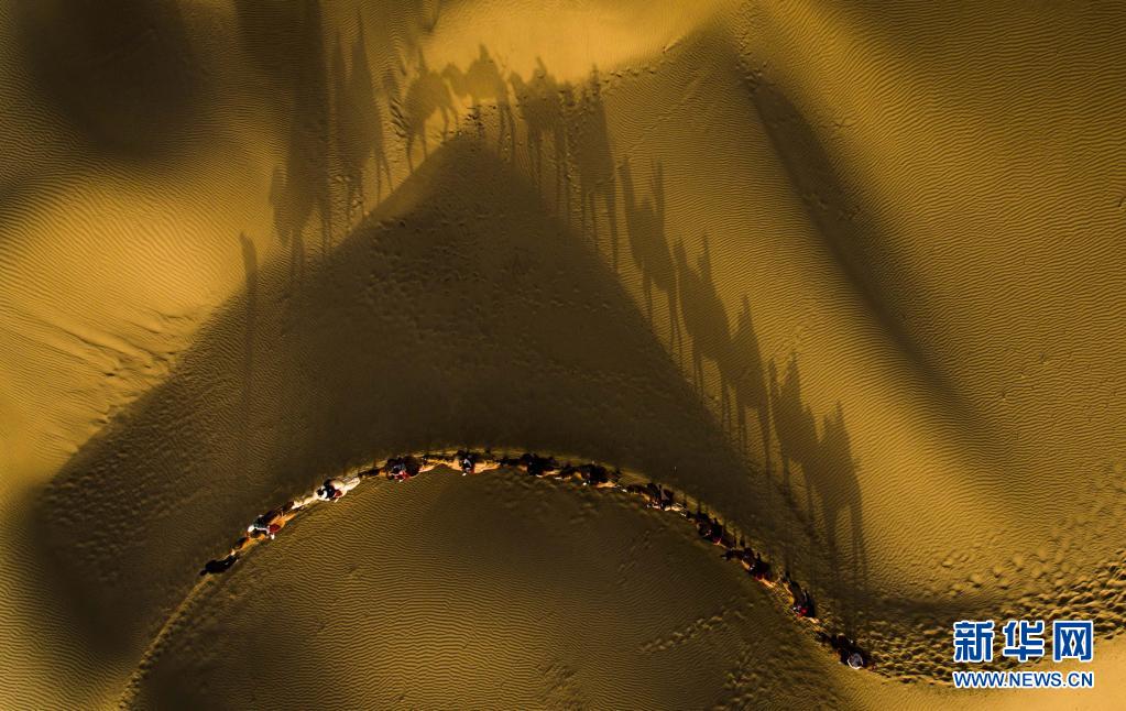 游客骑着骆驼在新疆尉犁县罗布人村寨内欣赏沙漠美景(2019年10月26日摄,无人机照片)。新华社记者 赵戈 摄