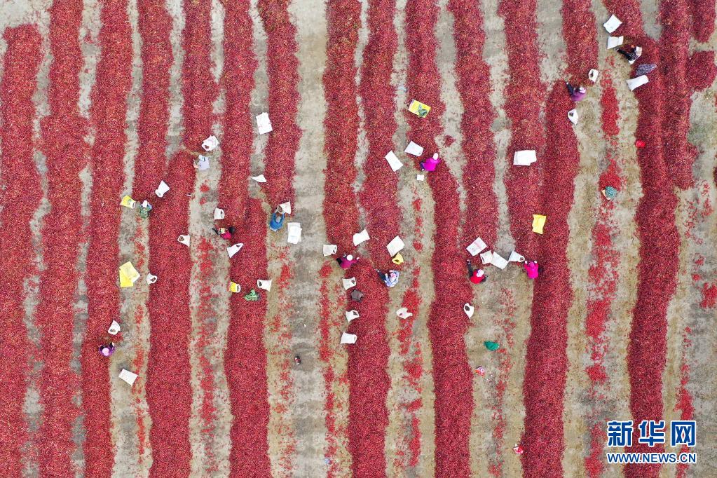 在新疆博湖县塔温觉肯乡,农民在晾晒辣椒(2019年10月13日摄,无人机照片)。博湖是新疆有名的“辣椒之乡”,种植辣椒已成为当地农民增收致富的支柱产业。新华社记者 丁磊 摄