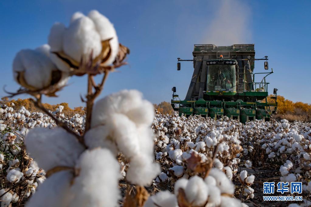 采棉机在新疆阿克苏地区沙雅县的一处棉田进行采收作业(2020年10月23日摄)。新疆是我国最大的棉花产区,2020年新疆棉花产量达516.1万吨,占全国棉花总产量87.3%。新华社记者 胡虎虎 摄
