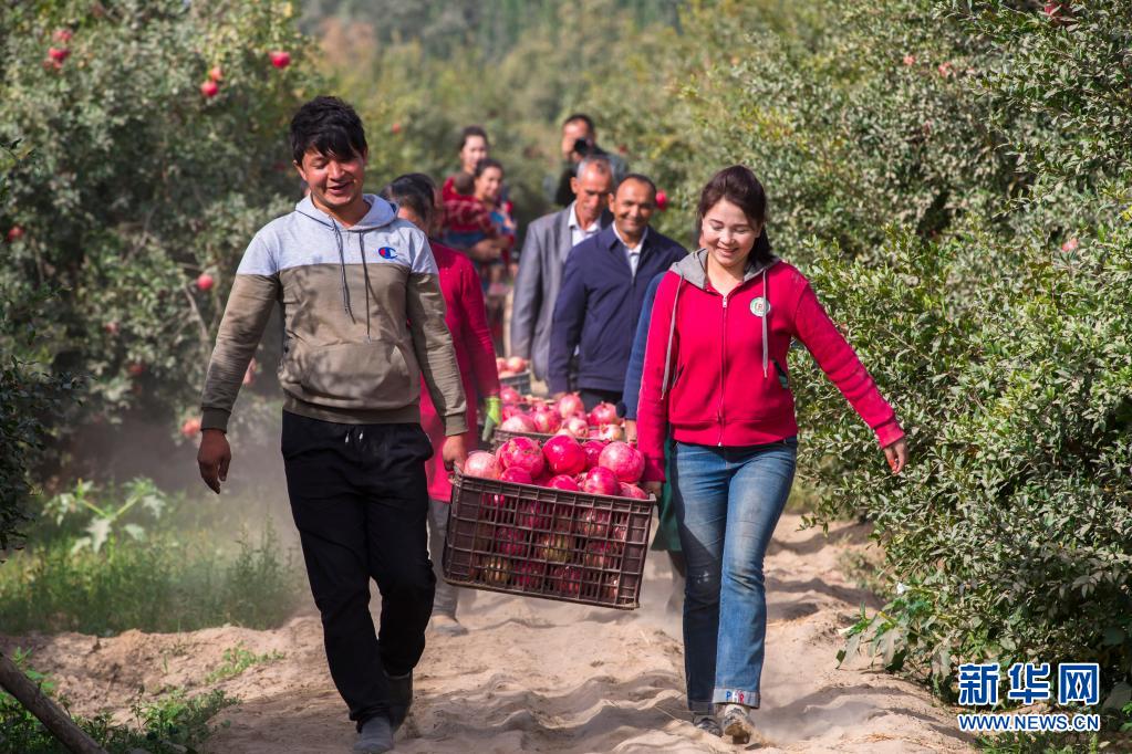 在新疆和田地区皮山县皮亚勒玛乡,当地农民在搬运采摘的石榴(2020年10月8日摄)。新华社发(阿迪力·那的尔 摄)