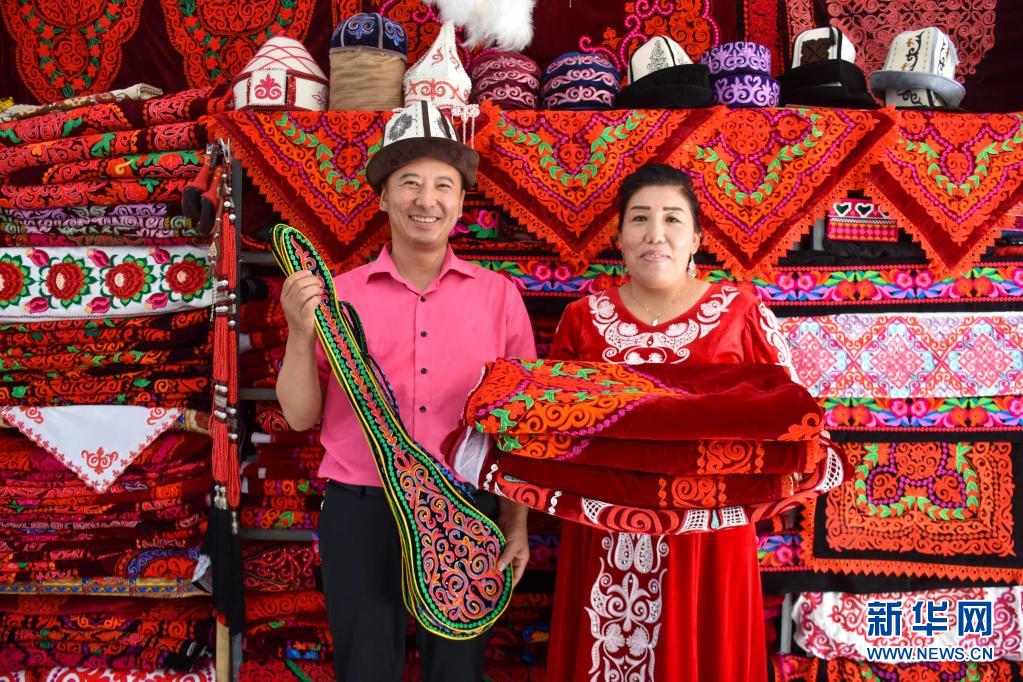在新疆阿克陶县丝路佳苑手工艺合作社内,艾拉努尔·吾普尔(右)和丈夫乃再尔·依迪西展示绣品(2020年9月20日摄)。新华社记者 高晗 摄