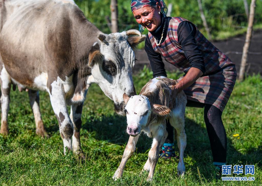 在新疆伊犁特克斯县境内的夏牧场里,一名牧民帮助刚刚出生的牛犊站起来(2020年7月2日摄)。新华社记者 王菲 摄