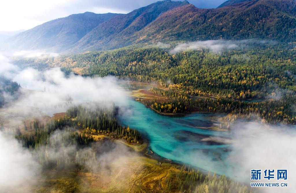 金秋时节,新疆阿勒泰地区喀纳斯景区内的林木与喀纳斯湖相互映衬,美不胜收(2019年9月24日摄,无人机照片)。