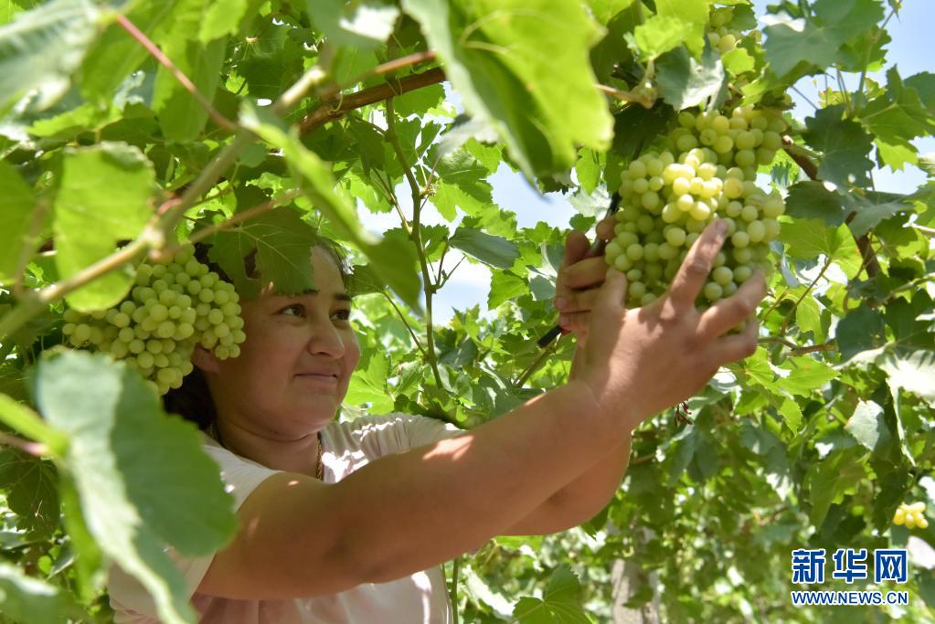 新疆吐鲁番市鄯善县鲁克沁镇沙坎村的农民在采摘葡萄(2019年7月1日摄)。新华社记者 丁磊 摄
