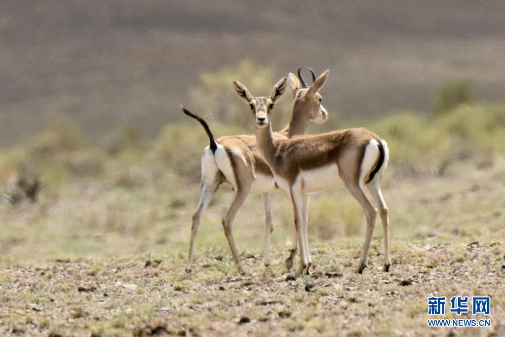 两只鹅喉羚在新疆卡拉麦里山有蹄类野生动物自然保护区四处张望(2020年6月6日摄)。新华社记者 丁磊 摄