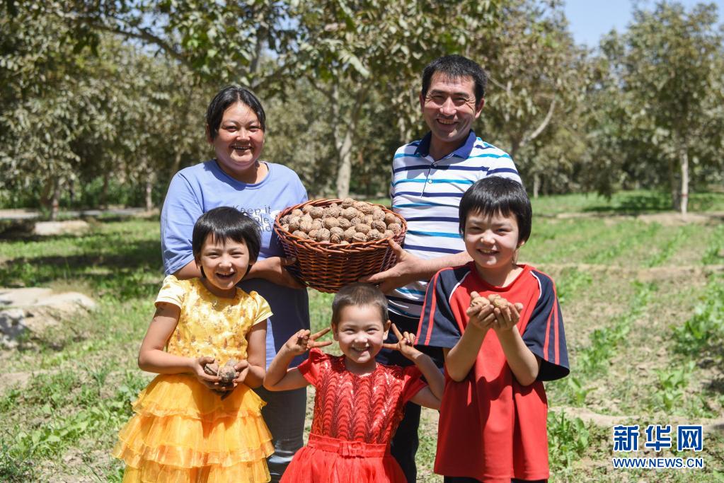 新疆和田市古江巴格乡赛克散村村民古海尔尼沙·阿吾提(后左)一家展示收获的核桃(2019年8月23日摄)。新华社记者 丁磊 摄