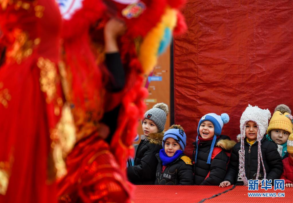 小朋友在新疆乌鲁木齐大巴扎步行街观看元宵节舞狮表演(2019年2月19日摄)。新华社记者 王菲 摄