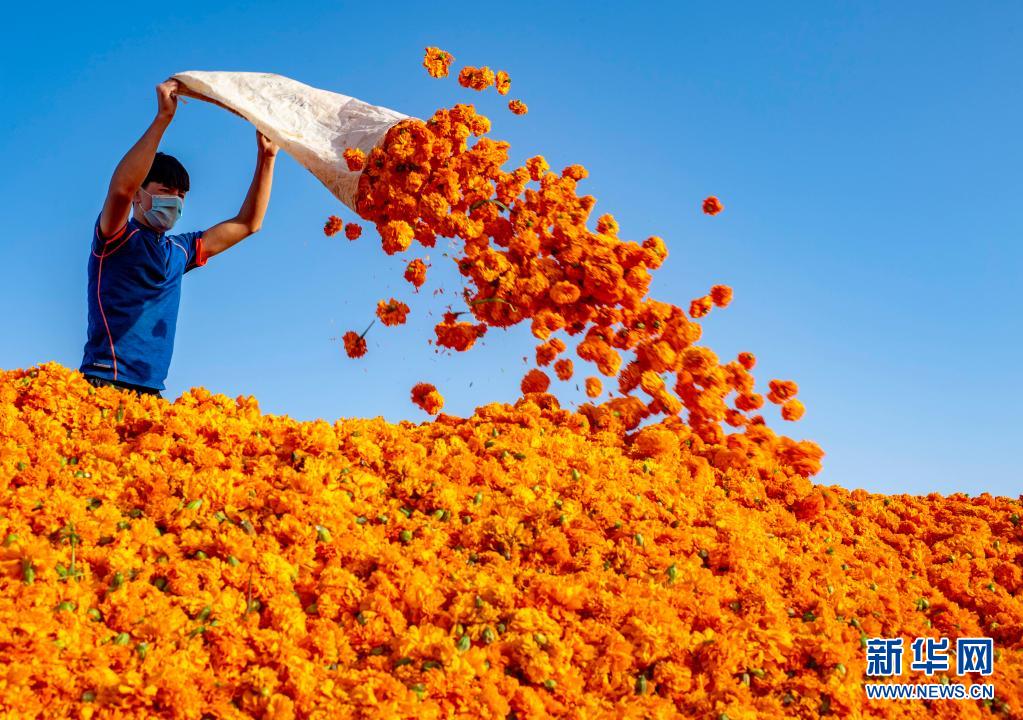 新疆于田县的村民将称重后的万寿菊倒入发酵池(2020年9月20日摄)。新华社记者 胡虎虎 摄