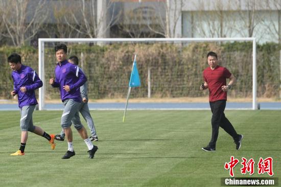 3月31日晚,天津津门虎足球俱乐部发布公告,宣布聘请于根伟为俱乐部总经理兼球队主教练。资料图为3月末,于根伟(右二)带领天津津门虎足球队进行首训。