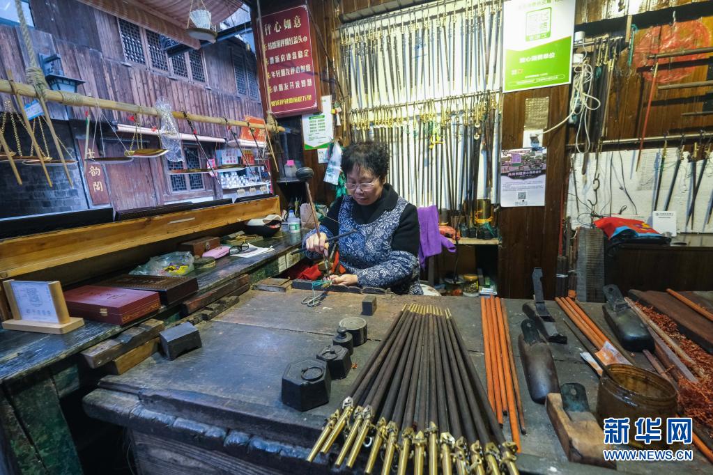 4月7日,在临海的台州府城文化旅游区紫阳街上,技艺传承人正在展示永利木杆秤制作技艺。