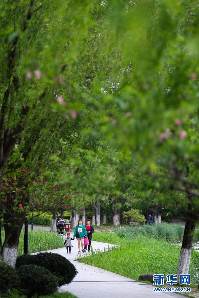 4月7日,游客在台州临海的灵湖景区观赏春色。