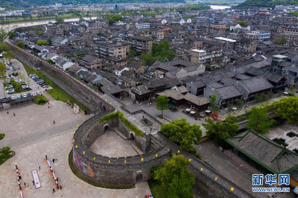 空中俯瞰台州临海的台州府城文化旅游区。这里囊括了江南长城、紫阳古街、东湖夜月、巾山塔群等知名景点,旅游资源丰富、层次多样(4月7日摄,无人机照片)。