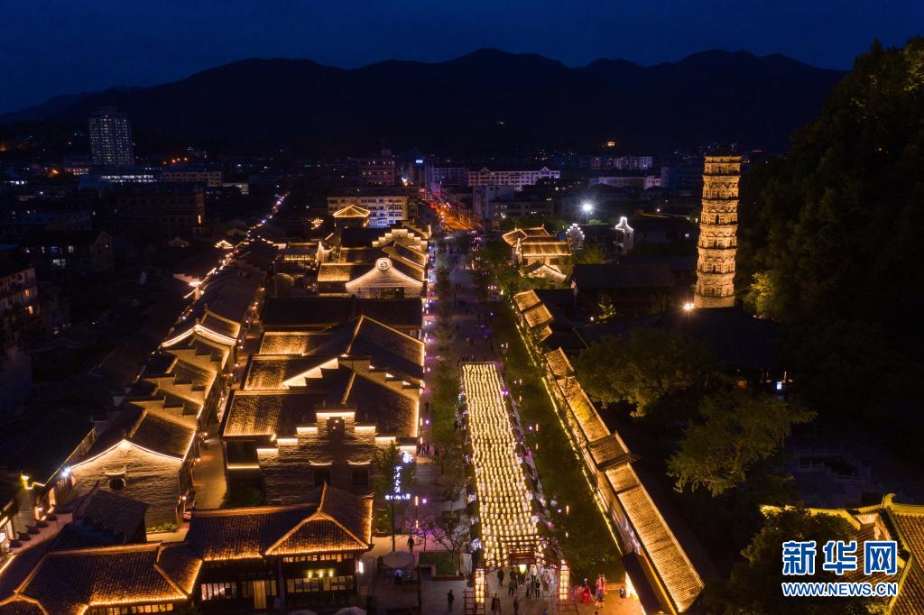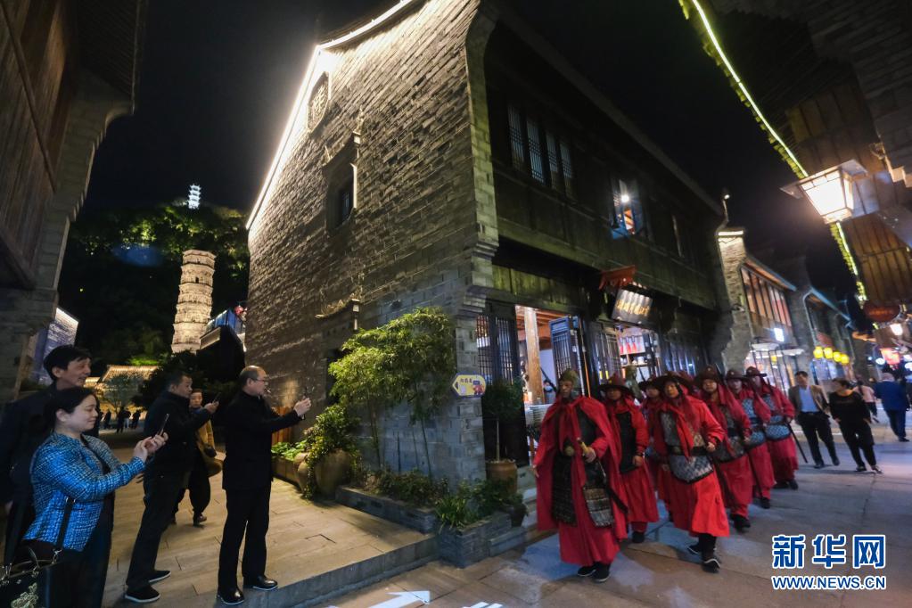 4月7日,游客在临海的台州府城文化旅游区内体验紫阳街的夜游项目,紫阳街是中国历史文化名街。