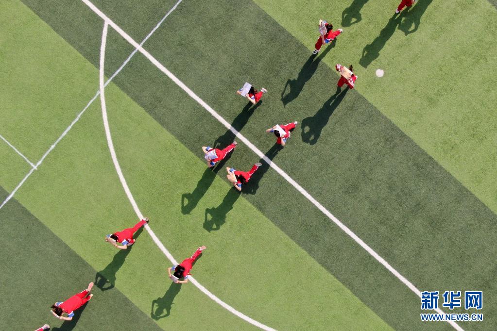 5月10日,河北省邢台市南大郭小学学生进行应急疏散演练(无人机照片)。