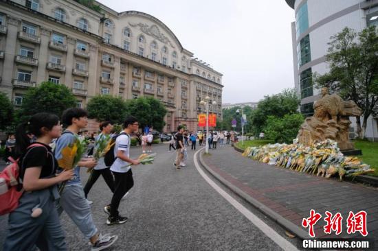 西南大学师生自发到袁隆平雕像前献花悼念。 何蓬磊 摄