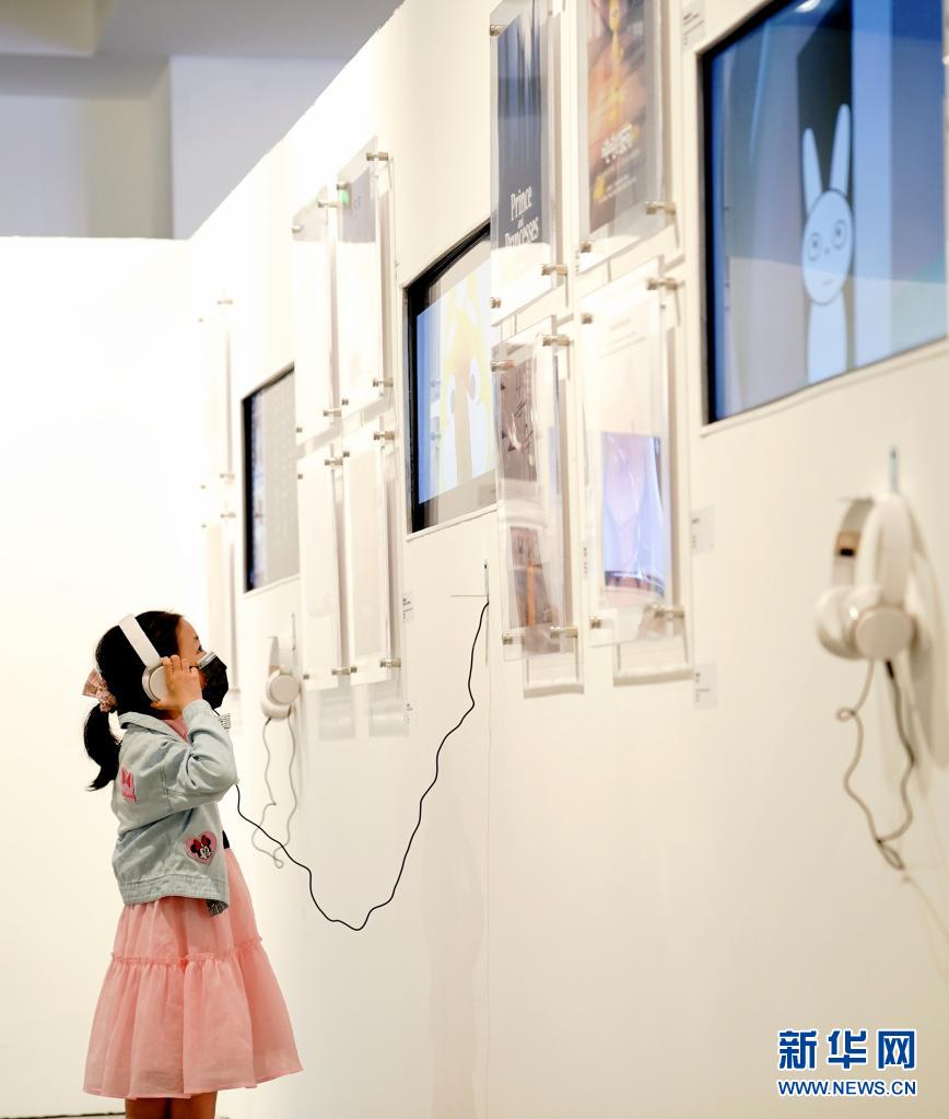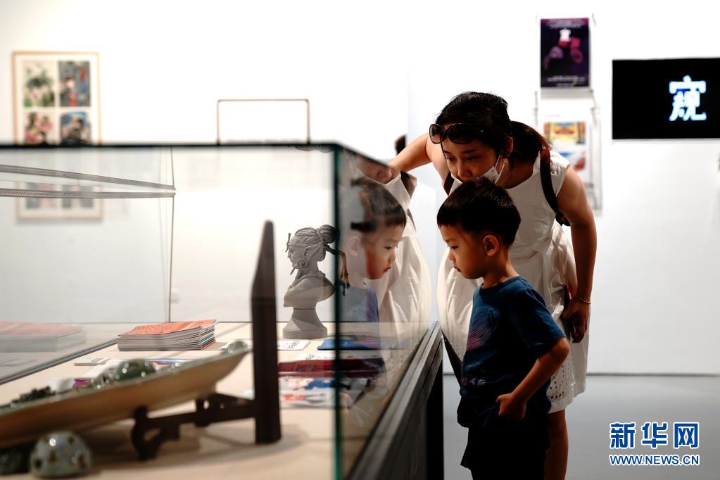 6月1日,小朋友在第二届全国动漫美术作品展上观看展出作品。