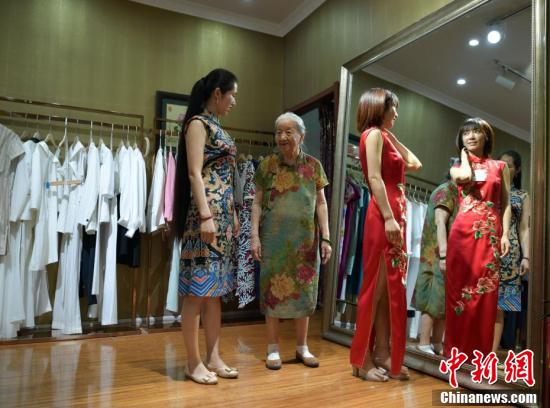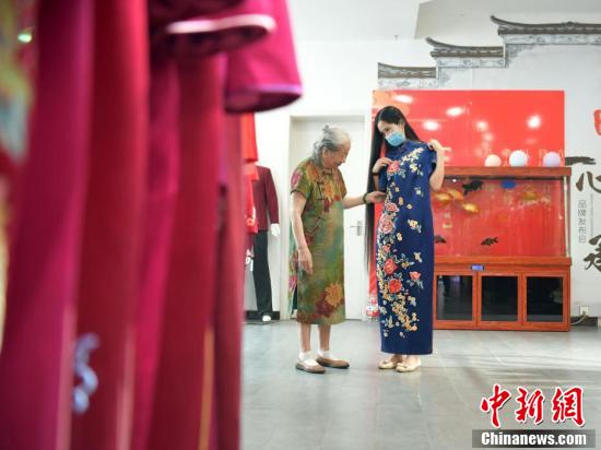 6月2日,河北石家庄,“旗袍奶奶”靳玉霞正在自家的制衣工作间忙碌。靳玉霞今年86岁,从事传统旗袍制作超过50年。靳玉霞年轻时痴迷传统服装设计,通过自学和从事服装设计工作,成为了一名服装设计师。图为靳玉霞(中)与试穿旗袍的顾客交流。 中新社记者 翟羽佳 摄