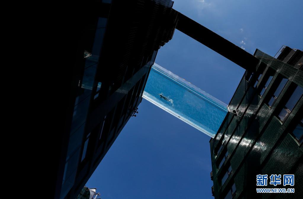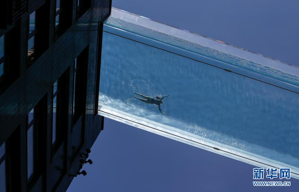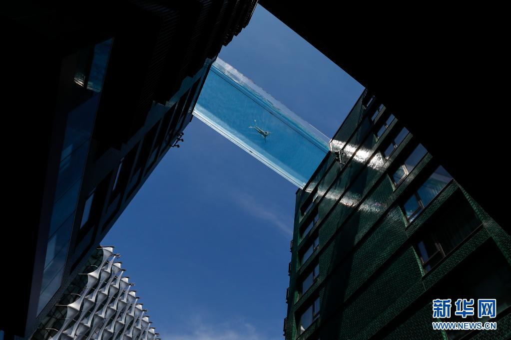 6月2日,一名男子在英国伦敦南部一个建造于两栋公寓楼之间的“空中泳池”游泳。