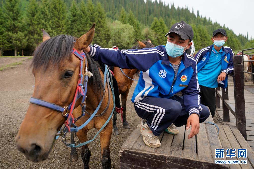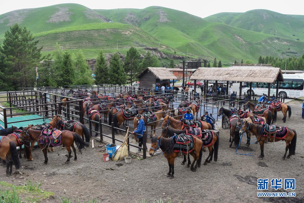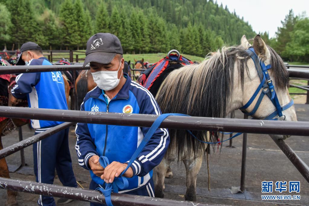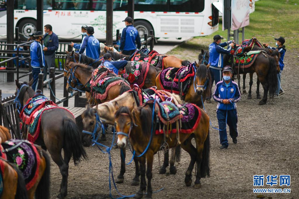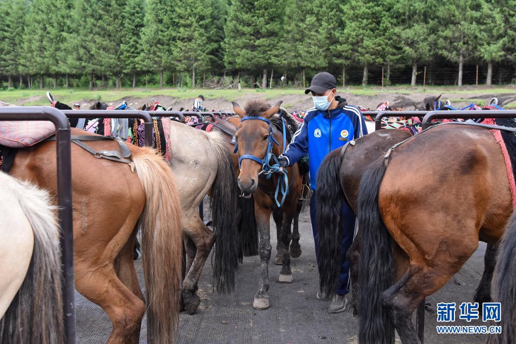 6月3日,在那拉提旅游风景区,马队合作社的牧民整理马匹等待游客。