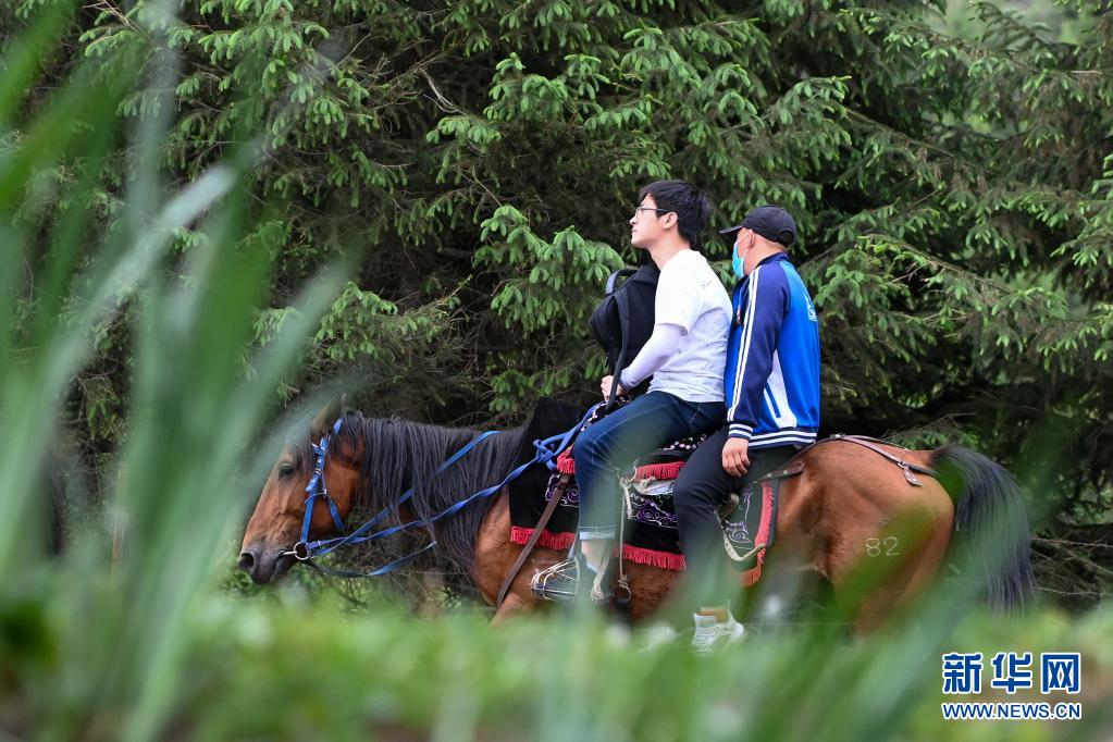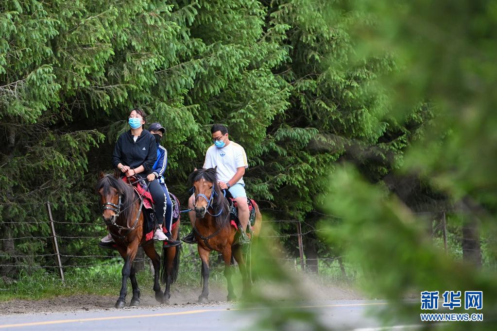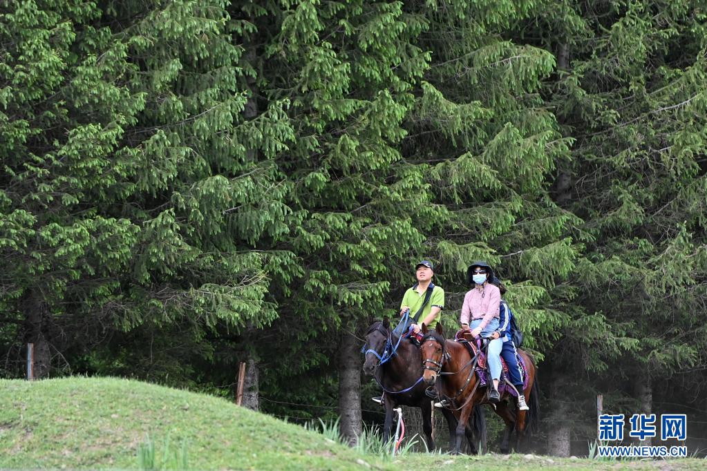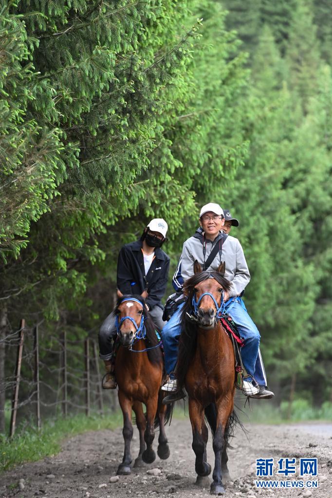 6月3日,游客在那拉提旅游风景区骑马游玩。