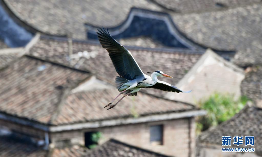 一只苍鹭在濂澳村上空展翅飞翔(6月3日摄)。