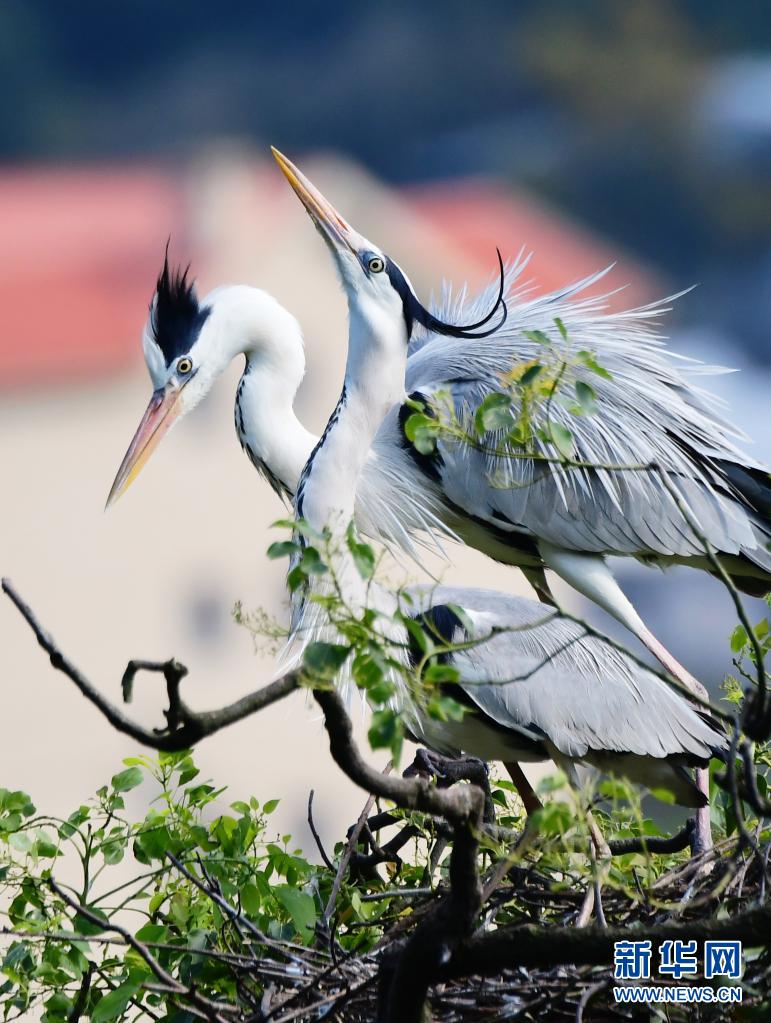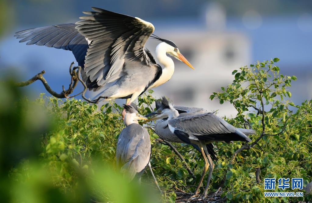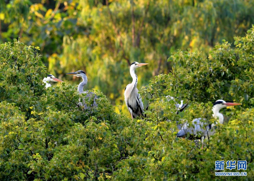 成群的苍鹭在树上筑巢栖息(6月3日摄)。