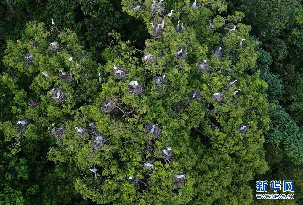 这是罗源县碧里乡濂澳村后山茂密的树林,成群的苍鹭在树上筑巢栖息(6月3日摄,无人机照片)。