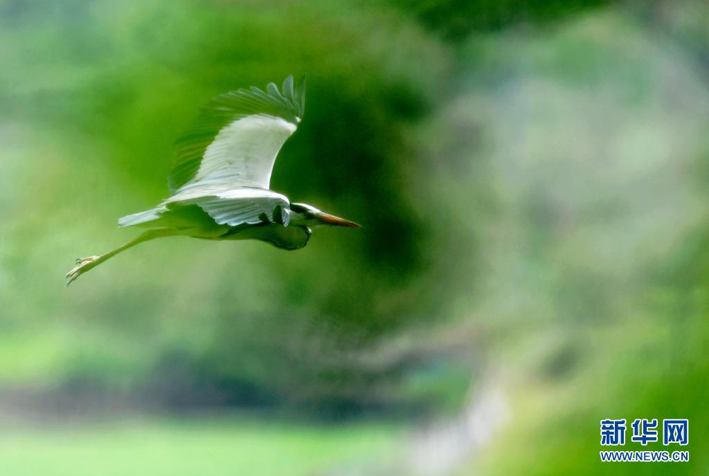 一只苍鹭在濂澳村上空飞翔(6月3日摄)。