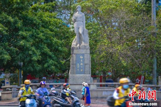 适逢中国共产党百年华诞,光辉历程波澜壮阔;回首沧桑巨变,轨迹浮光跃金……琼崖纵队是中国共产党于1927年9月领导海南岛农民起义创建的人民武装,声名遐迩的红色娘子军便在此列。在土地革命战争、抗日战争和解放战争中,琼崖纵队长期艰苦卓绝孤岛奋斗,为海南解放和中国革命胜利立下了不朽的功勋。星移斗转,曾经战火纷飞的海南岛成为著名的国际旅游目的地。从1988年4月建省创办中国最大经济特区,再到“建设自贸港”,这个偏隅中国南端,曾经社会封闭、经济落后的热带岛屿,徜徉改革开放潮头,驶入高速发展车道。新时代机遇,新历史起点,海南人传承发扬琼崖革命精神,激扬百年追梦浪潮,高歌奔向建设中国特色自由贸易港宏伟目标!图为海南省琼海市的红色娘子军塑像。(2021年5月26日摄) 中新社记者 骆云飞 摄