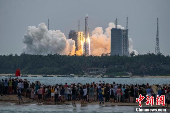 2021年4月29日北京时间11时23分,搭载空间站天和核心舱的长征五号B遥二运载火箭,在中国文昌航天发射场点火升空。发射任务取得圆满成功,标志着中国空间站在轨组装建造全面展开,为后续关键技术验证和空间站组装建造顺利实施奠定了坚实基础。 中新社记者 骆云飞 摄