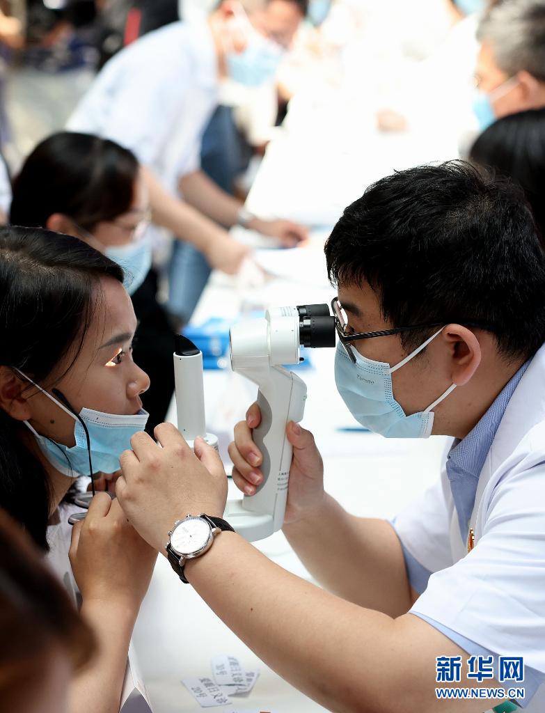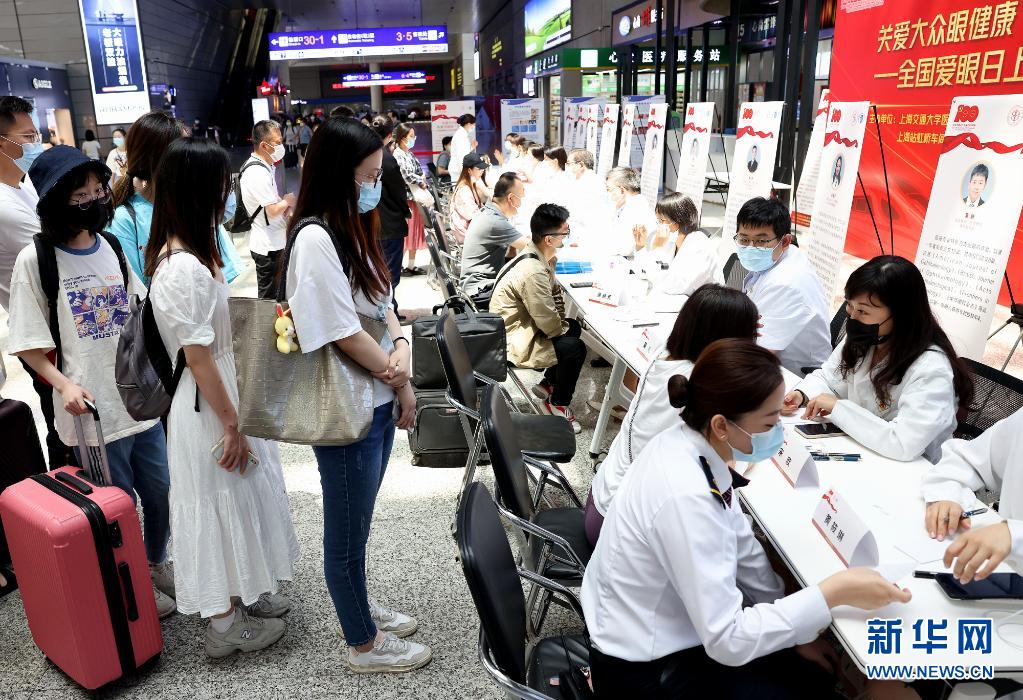 6月6日,医务人员在上海虹桥火车站候车大厅为旅客检查眼睛。