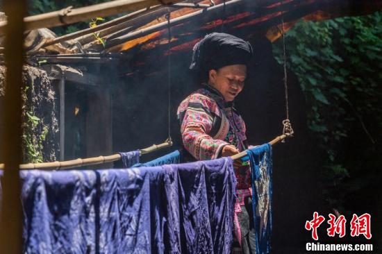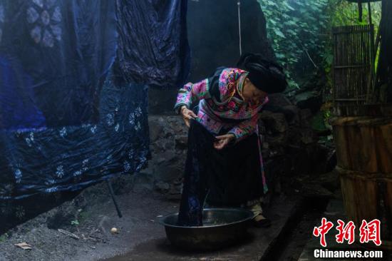 画娘把画好蜡的布艺放置在指定所要颜色的植物染色液的染缸里浸泡,让布艺上色。魏廷华 摄